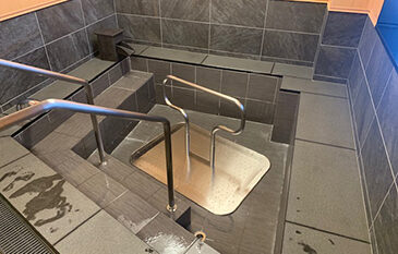 | 現状 | ・浴槽の出入り部分には手すりがあるものの、浴槽内の移動において手すりがなかった。 ・浴槽奥まで移動するのに、体の不自由な方にとっては不安があった。 ・誰もが利用できる温泉旅館を目指し、福祉用具の整備を検討していた。 |